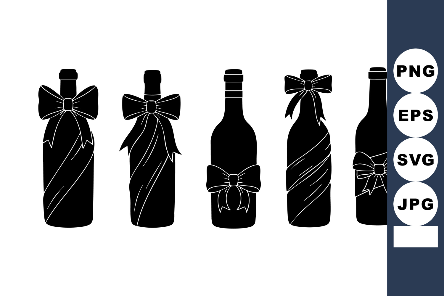 Vector illustration shows five black silhouette wine bottles decorated with bows and ribbons in a simple style, creating a festive mood.