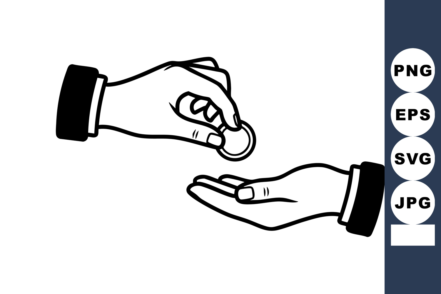 Vector shows one hand giving a coin to another hand, symbolizing payment, donation, or in a minimalist black and white style. Clear and straightforward mood.