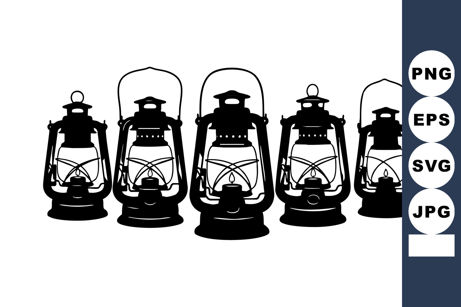 This vector features five vintage kerosene lanterns in silhouette, emphasizing rustic and nostalgic lighting themes in black and white style, creating a classic and timeless mood.