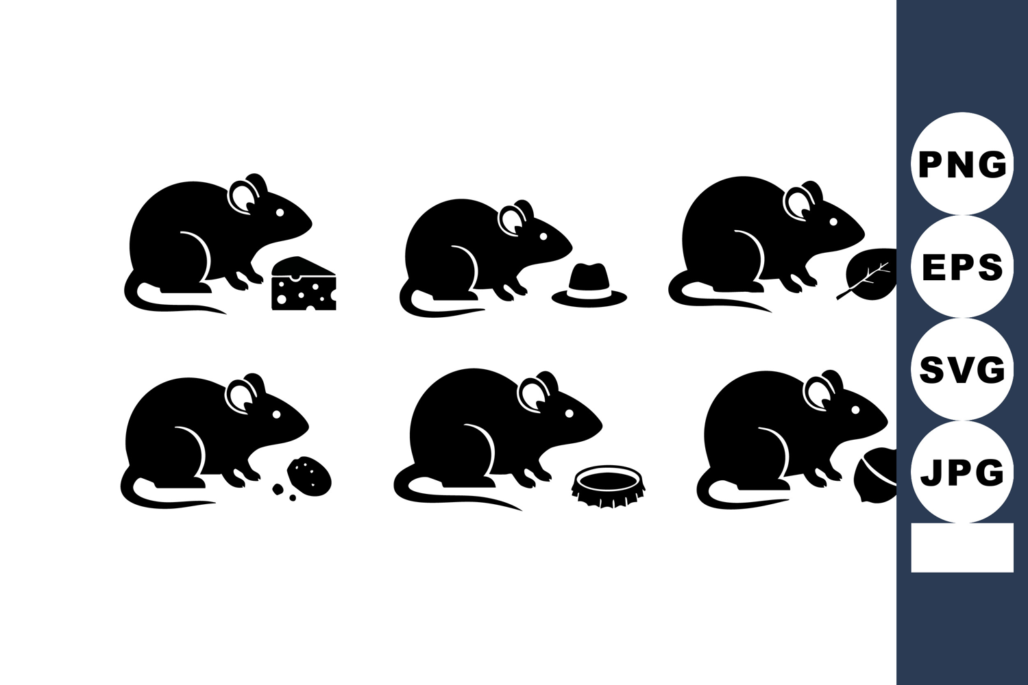 Six black mouse silhouette icons each interacting with different food or objects including cheese, hat, leaf, cookie, bowl, and ball in minimal vector style. Playful mood.