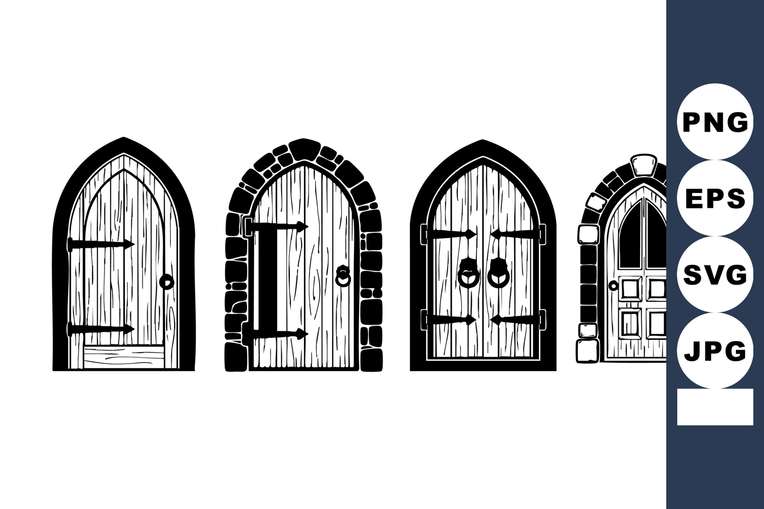 This vector features four detailed medieval wooden doors with stone arch frames in black and white. The design suits architectural and historical themes with a classic mood.