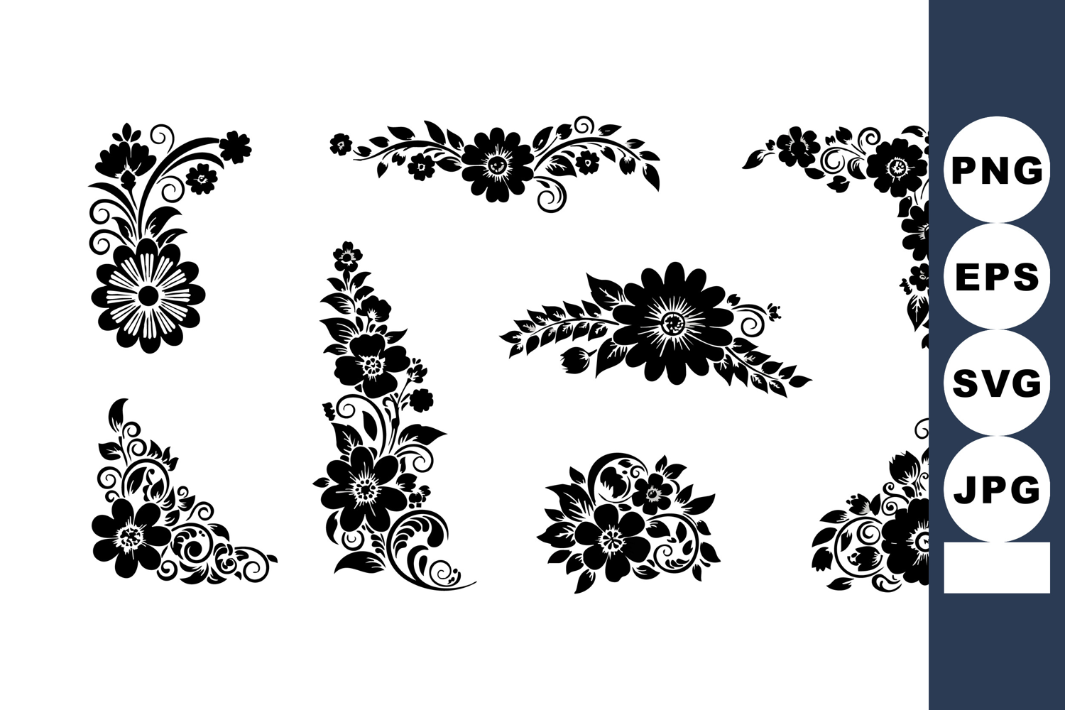 This vector features elegant black floral corner and border elements with detailed flowers and leaves, perfect for enhancing design projects with a classic and sophisticated mood.