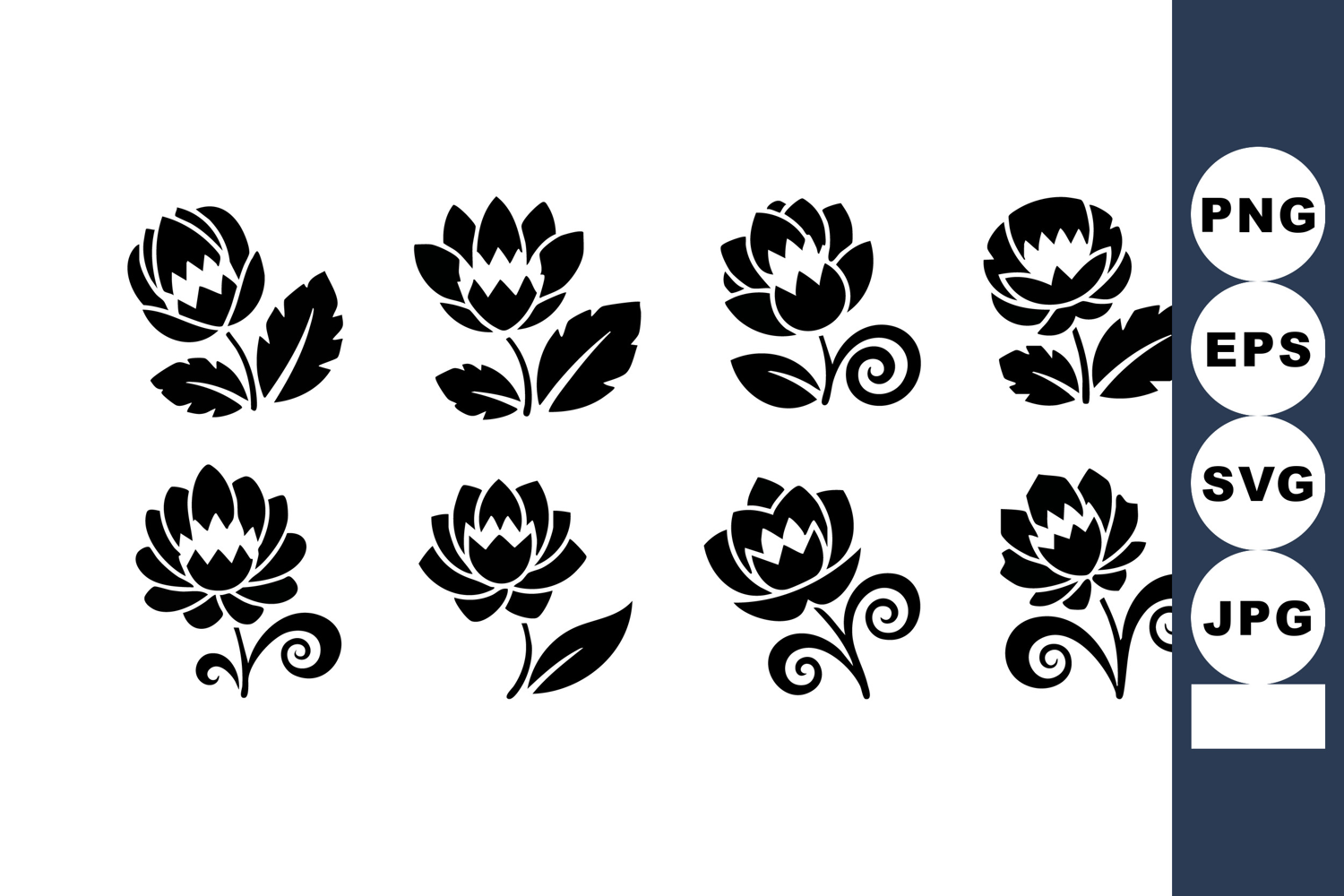 This vector features stylized black and white flower icons with leaves and elegant swirls, perfect for decorative design and creative projects. The style is minimalistic and artistic. Calm.