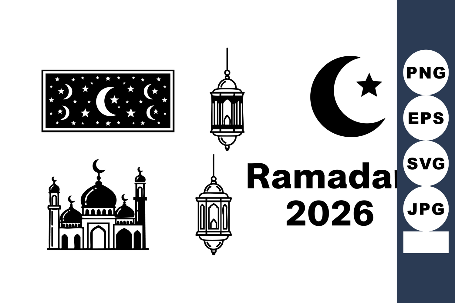 Vector illustration features Ramadan 2026 text with crescent moon, star, mosque, and lanterns in black and white style, symbolizing Islamic celebration and spirituality. Calm mood.