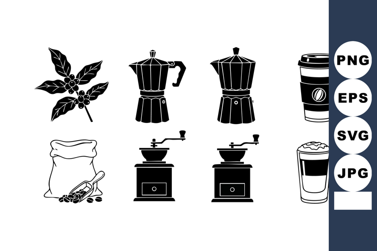 Vector Coffee Black White Cup Pot Beans Grinder Takeaway Moka