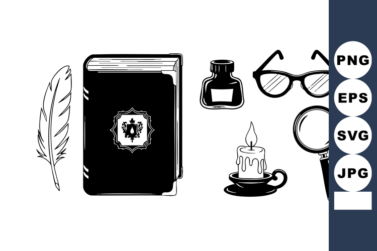 Black and white vector illustration features vintage writing tools including feather pen, ink bottle, old book, candle holder, glasses, and magnifying glass in classic style, nostalgic mood.