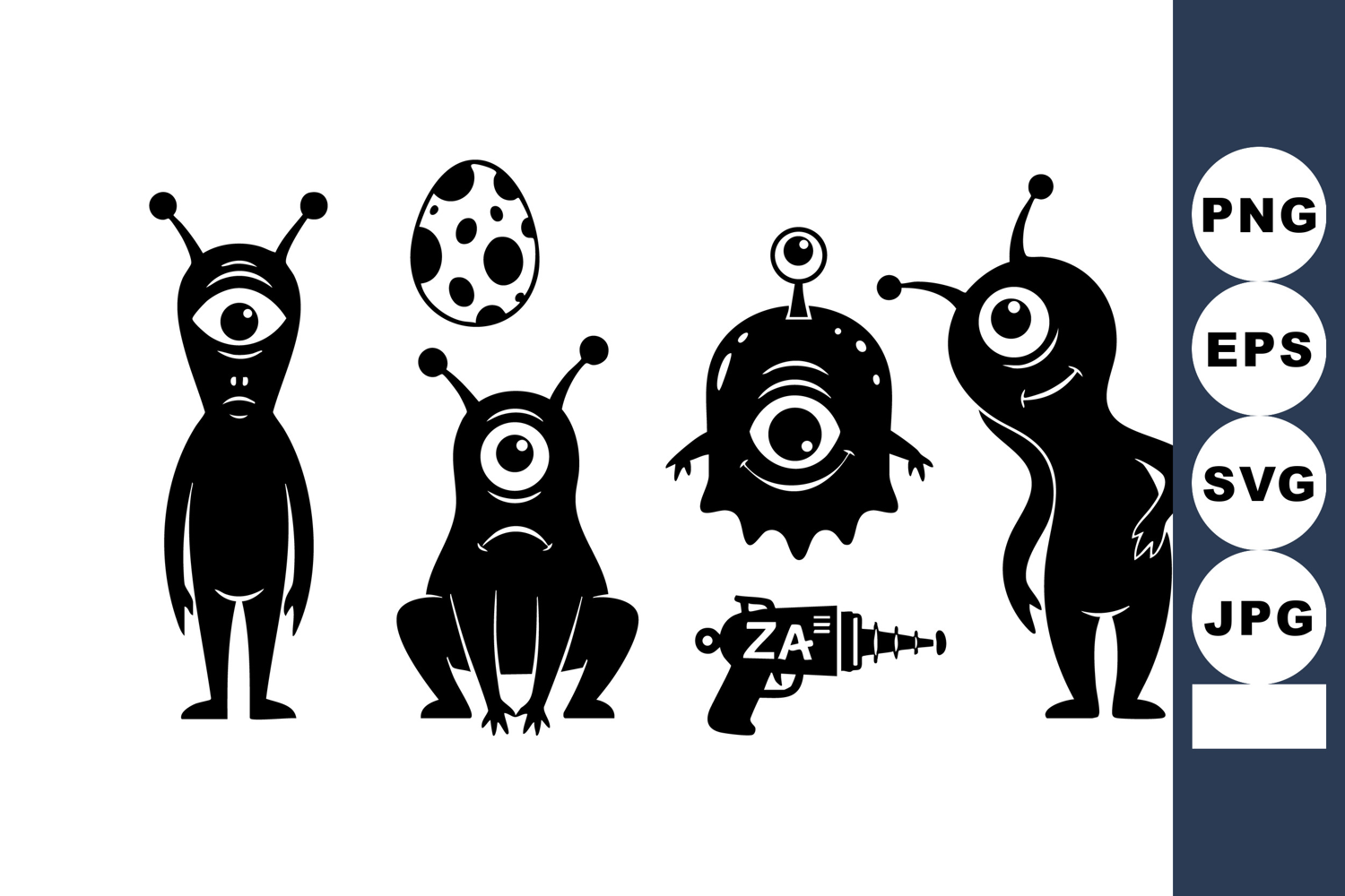Vector design shows four black silhouette cartoon alien monsters with one eye and antennae, including one holding a ray gun. The style is playful and imaginative, evoking a fun mood.