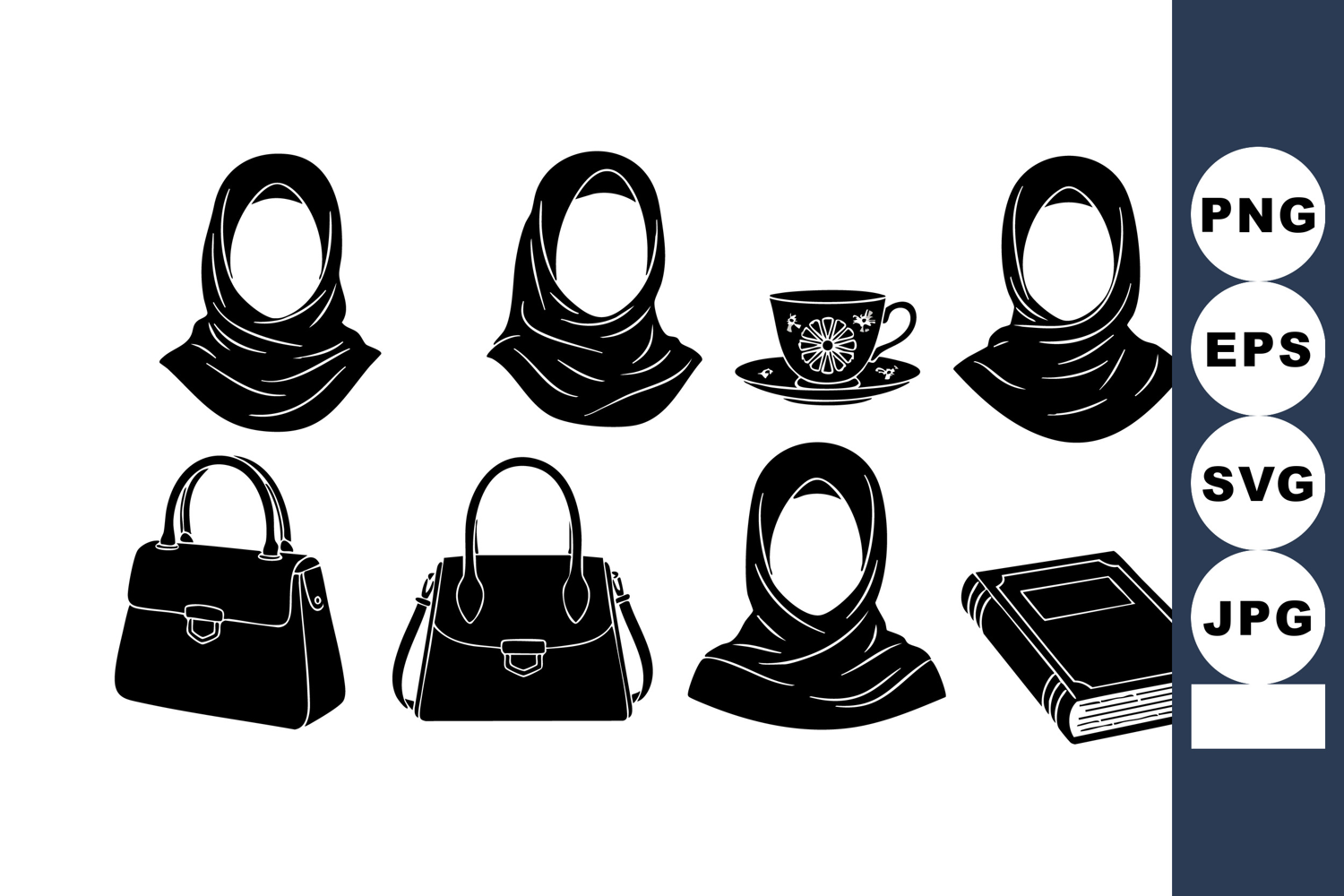 This vector features black hijab woman faces, handbags, a coffee cup, and a book icon in simple monochrome style, perfect for design projects and creative use. Minimalist and elegant.