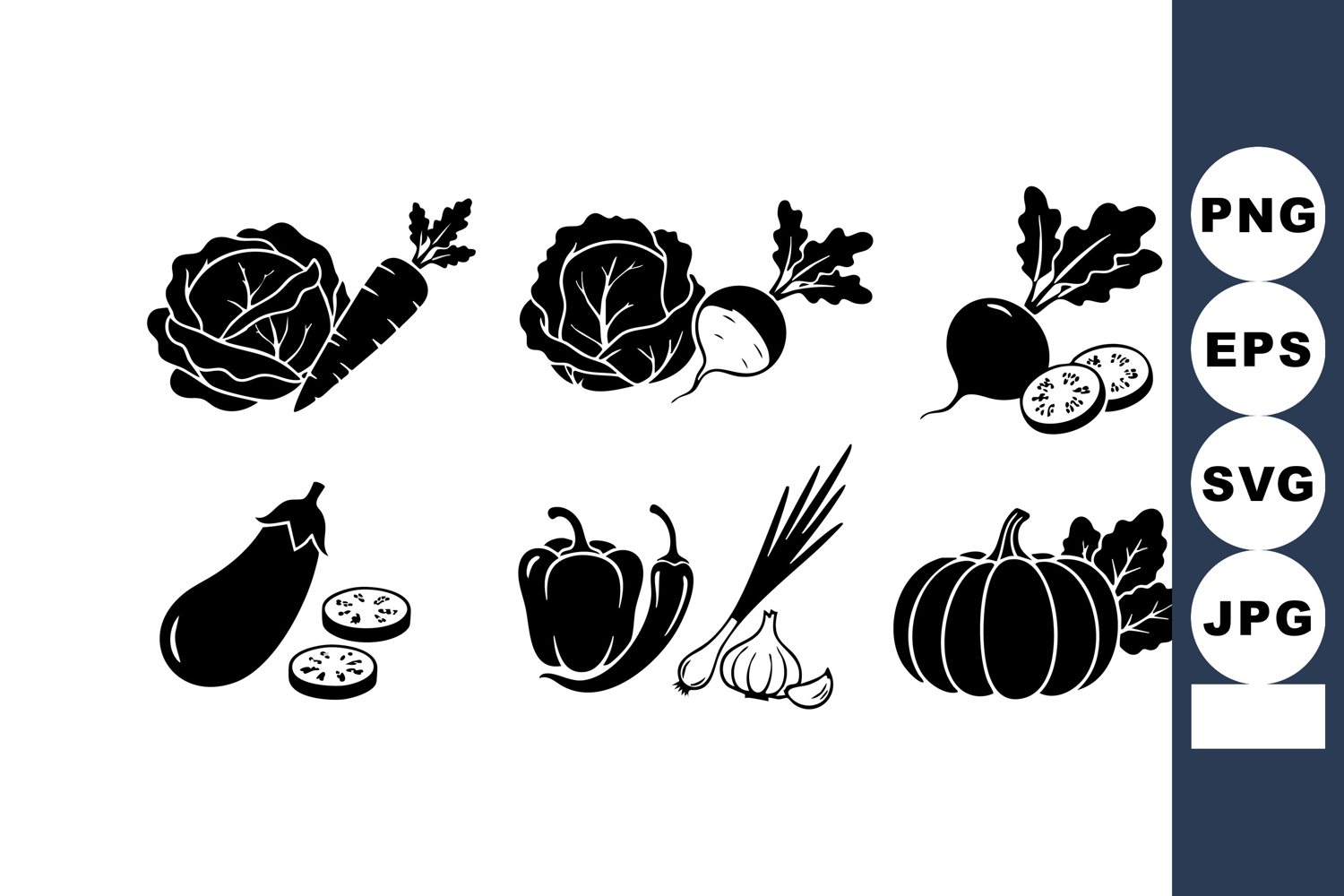 Vector illustration shows black and white fresh vegetables such as cabbage, radish, eggplant, pepper, garlic, and pumpkin with leaves, presented in simple silhouette style, clean and minimal, natural mood.