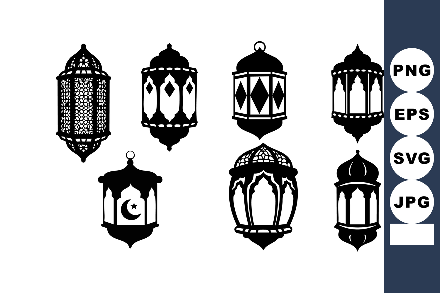 This vector image showcases seven traditional Arabic lanterns with detailed patterns and geometric shapes. The design highlights cultural artistry and decorative lighting in black silhouette style, elegant mood.