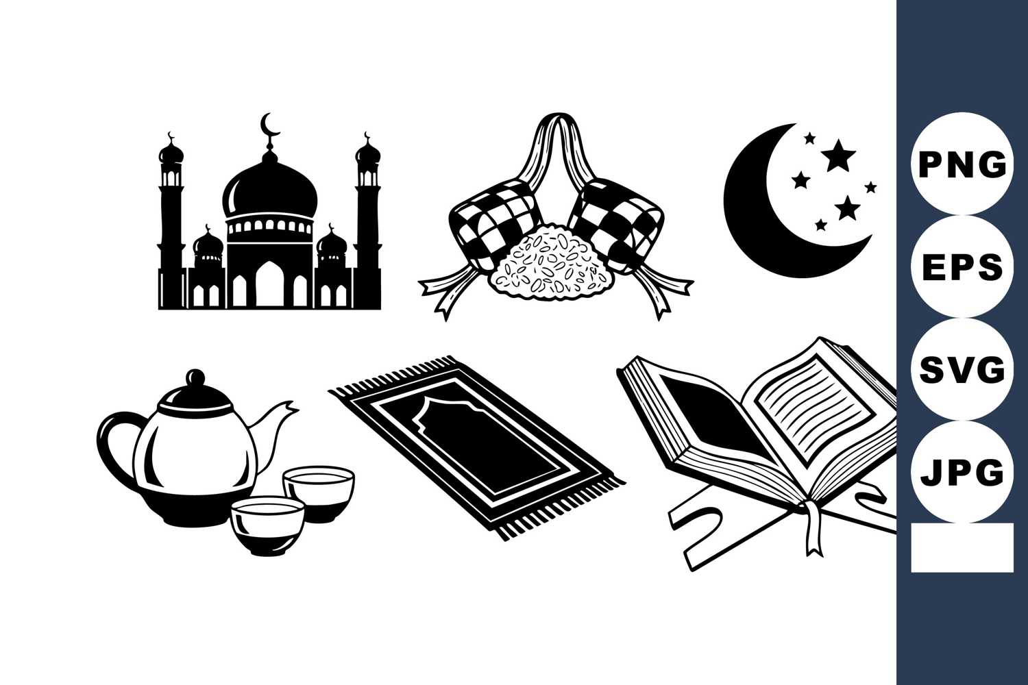 Vector features iconic Islamic symbols including mosque, crescent moon with stars, prayer rug, tea , and open Quran, presented in black silhouette style for cultural and religious themes. Calm.