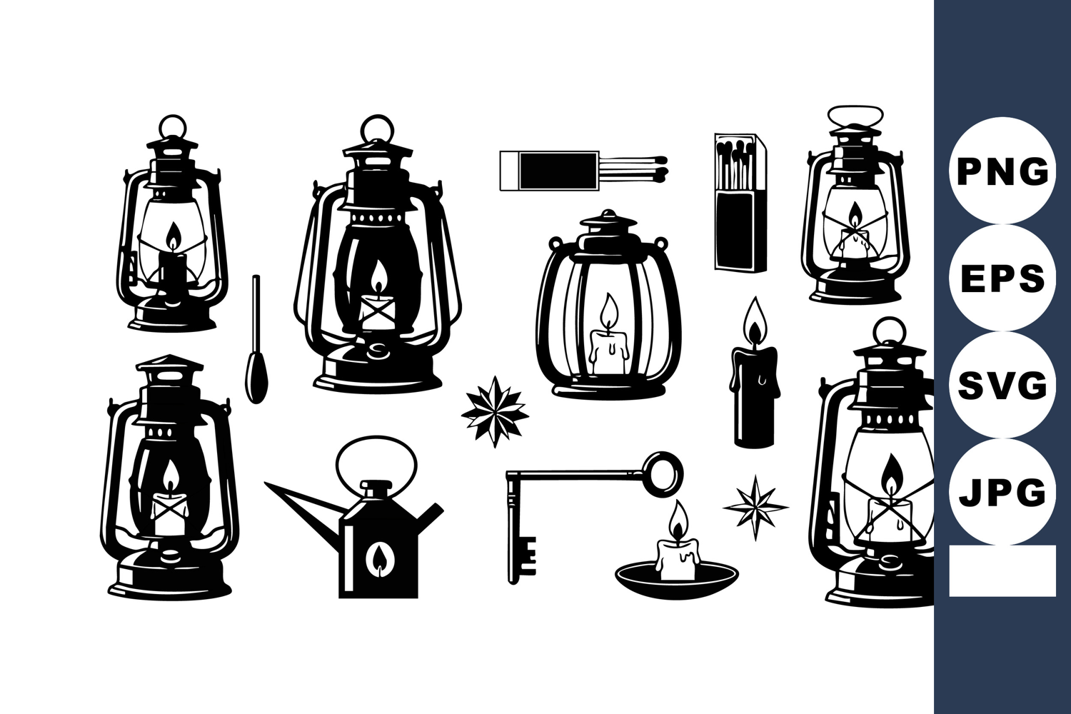 This vector features a variety of vintage lanterns, oil lamps, candles, keys, and matches in black and white, emphasizing classic lighting tools with nostalgic charm. Calm mood.
