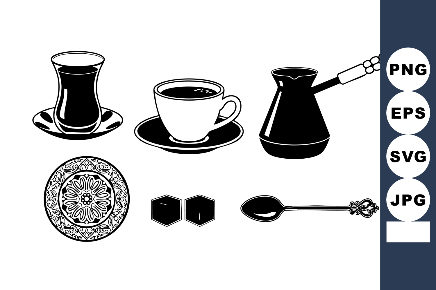This vector image shows a traditional Turkish coffee including a cezve pot, coffee cup, saucer, sugar cubes, decorative plate, and spoon in black and white style, classic and elegant.
