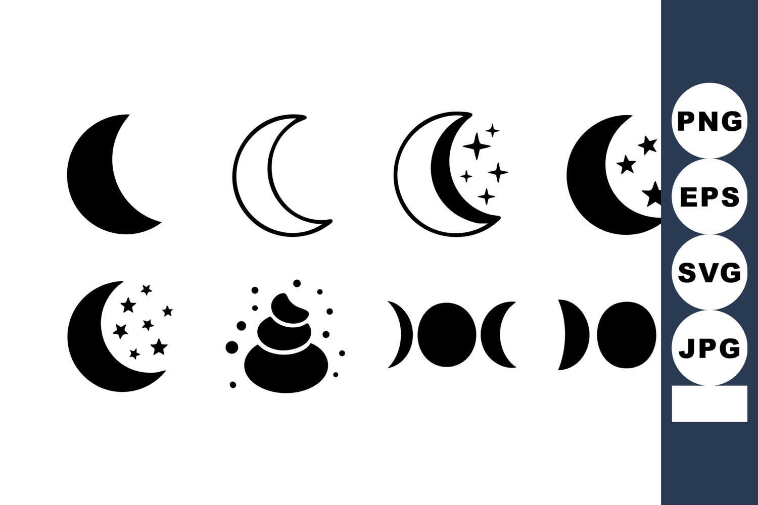 Black and white crescent moon icons showing various phases with stars and mystical elements in a clean vector style. Perfect for design, decoration, and celestial themes. Calm and mysterious.