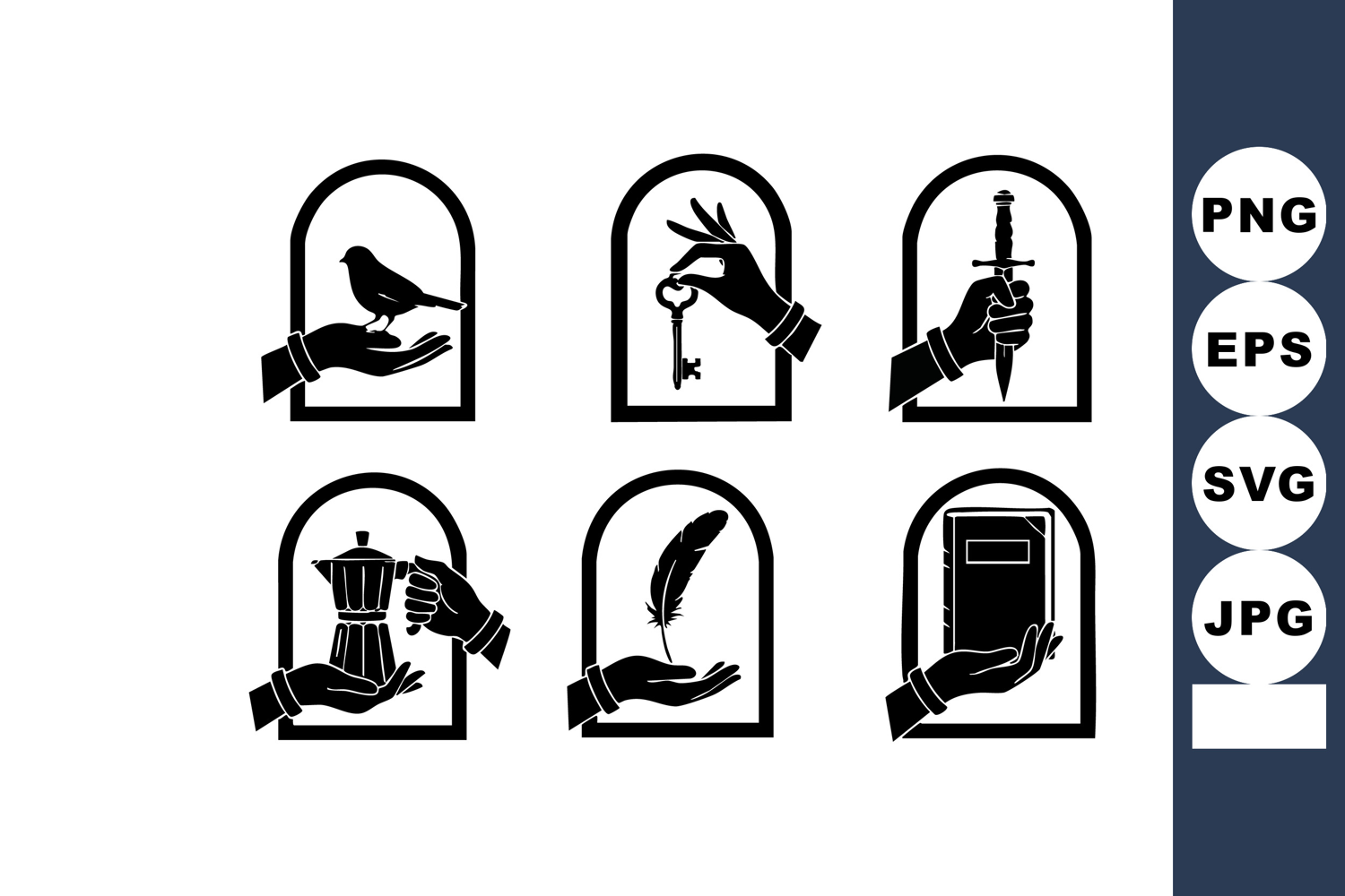 This vector features black silhouette hands presenting symbolic objects such as a bird, key, syringe, coffee maker, feather, and book, all framed in arched windows, conveying meaning with simplicity and contrast. Calm atmosphere.