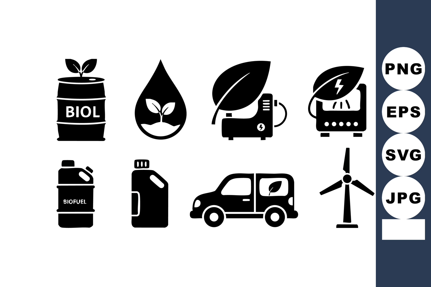Vector displays biofuel containers, leaf with plug, electric car, wind turbine, and water drop with plant, representing renewable energy and sustainability in a clean style. Eco-friendly mood.