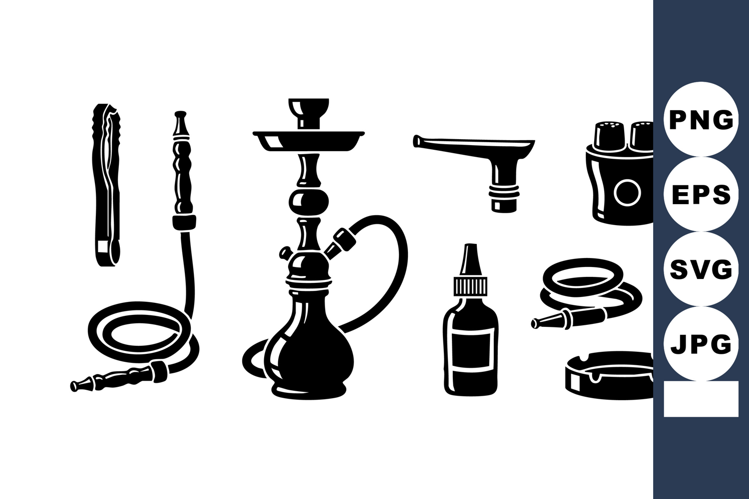 This vector image displays a complete of hookah smoking accessories including hose, mouthpiece, lighter, and cleaning brush in black silhouette style, providing a clear and simple design. Calm and minimalistic.