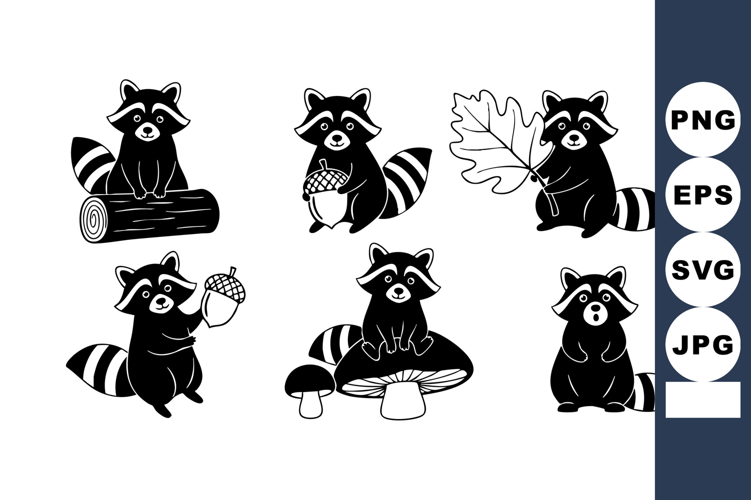 This vector displays six adorable raccoon illustrations in various playful poses holding forest objects like acorns, mushrooms, leaves, and logs. The black and white style highlights woodland charm and nature vibes. Cheerful mood.