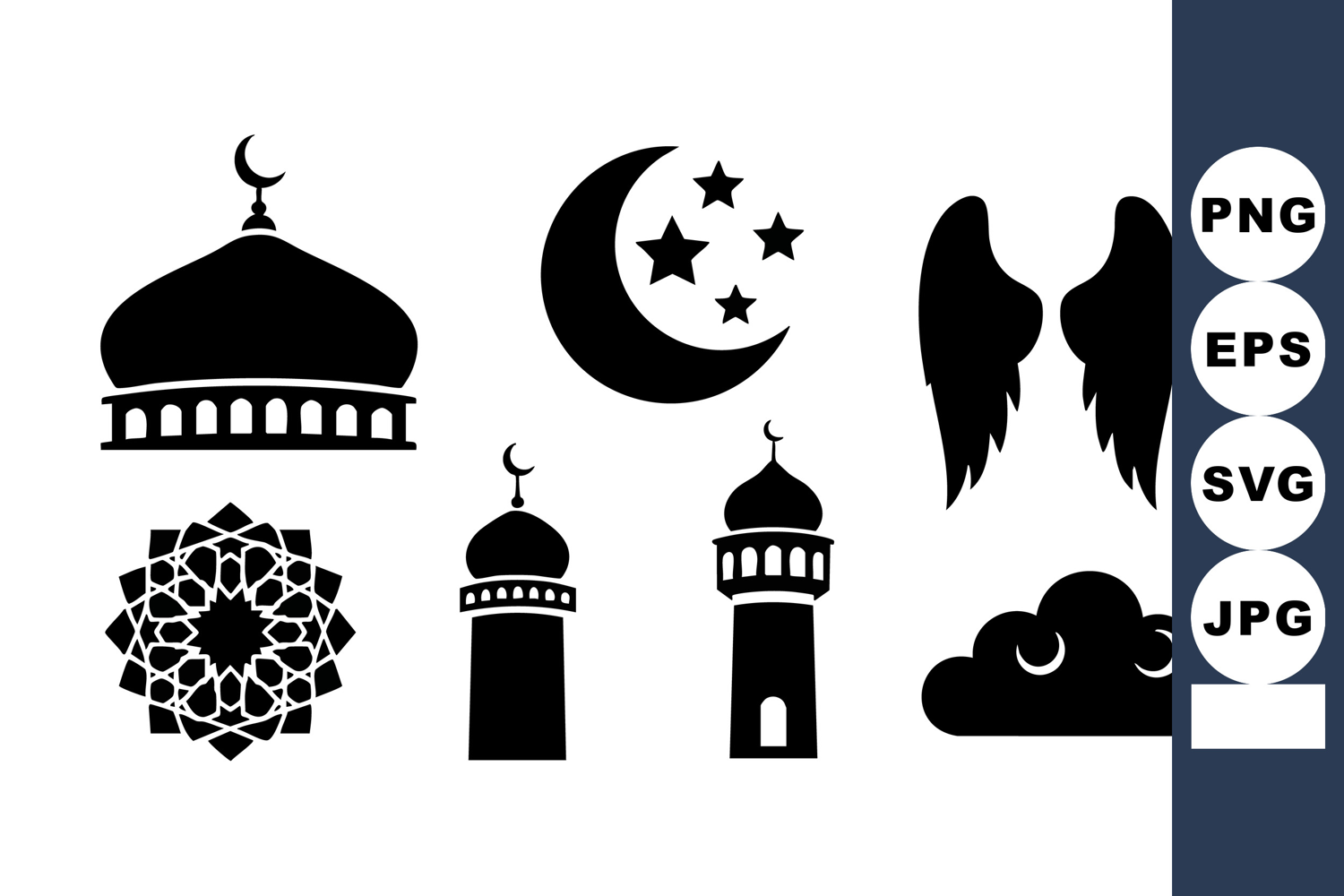 This vector features Islamic symbols such as mosque domes, crescent moon with stars, minarets, wings, and geometric pattern in black silhouette style for cultural and religious design projects. Calm.