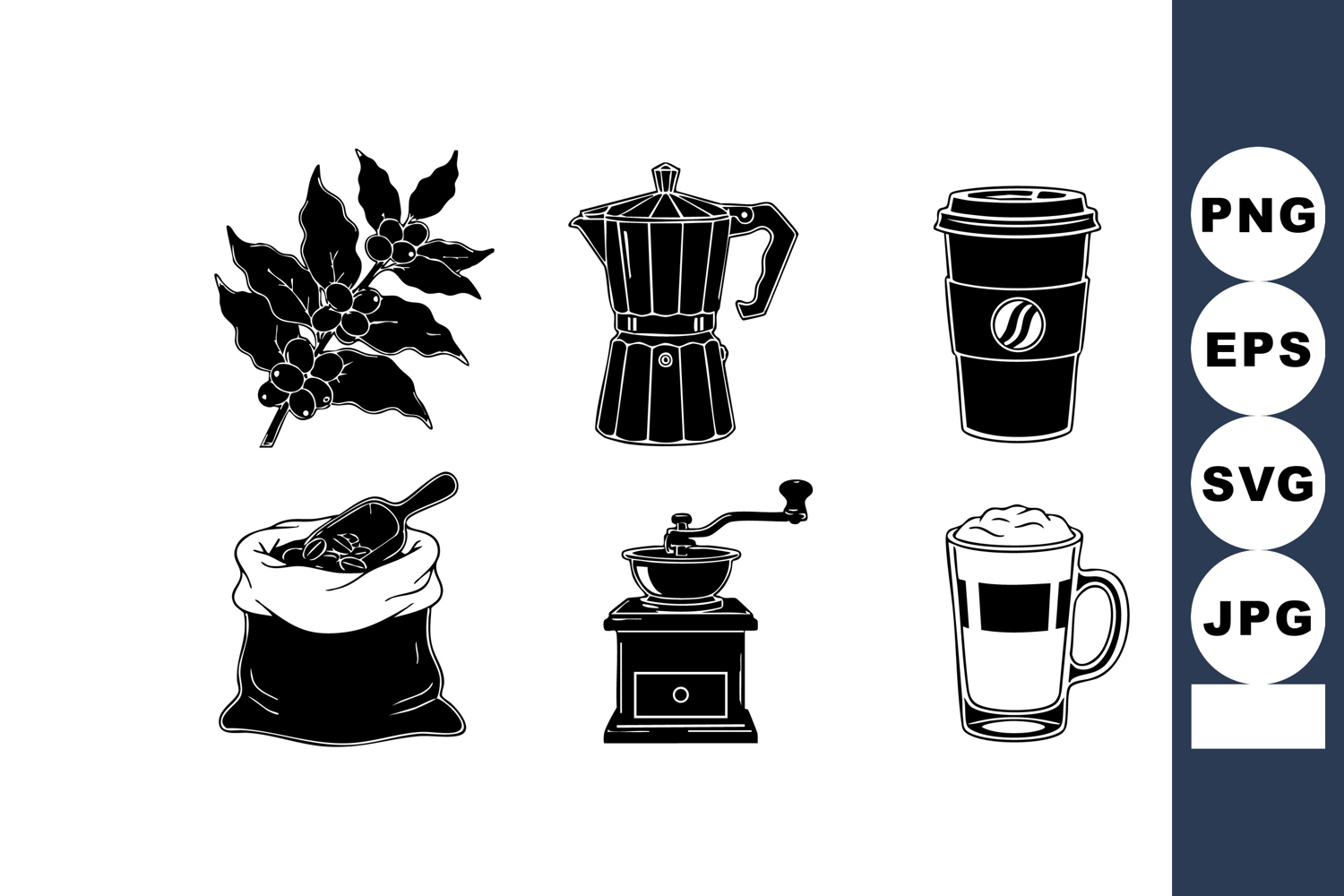 This vector features black silhouette icons of coffee beans, moka pot, take away cup, coffee sack, grinder, and latte cup, showcasing classic coffee elements in a simple style, calm.