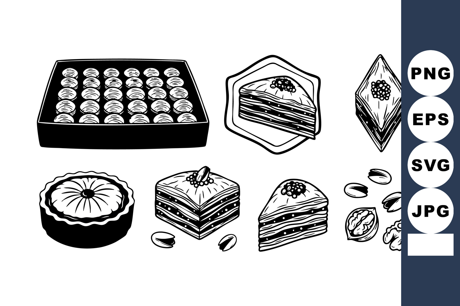 This vector illustration shows various Middle Eastern baklava desserts with nuts in black and white style. The design captures intricate details of sweets and nuts, creating a classic mood.