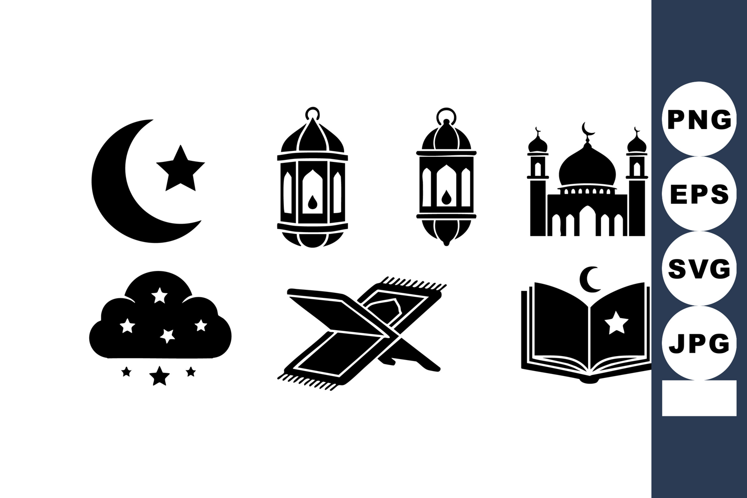 This vector shows Islamic symbols including crescent moon, star, mosque, lanterns, prayer book, and cloud in black silhouette style for cultural and religious use. Calm mood.