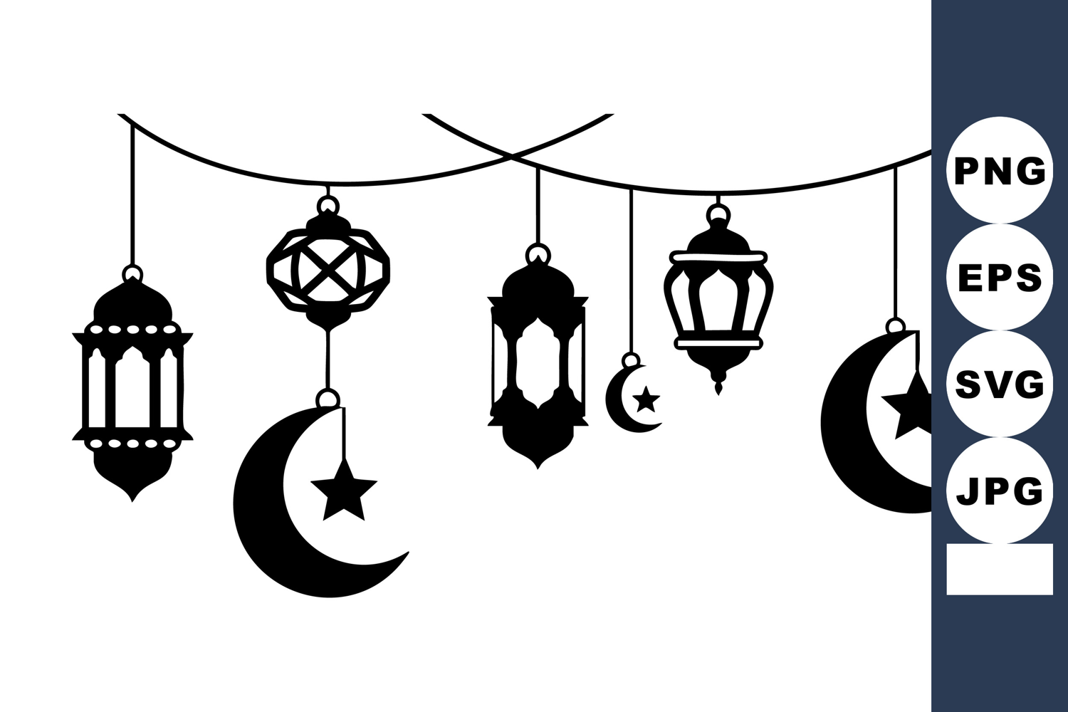 Black silhouette of hanging Islamic lanterns and crescent moons with stars, commonly used for Ramadan and Eid decorations. Simple and elegant festive vector art. Calm mood.