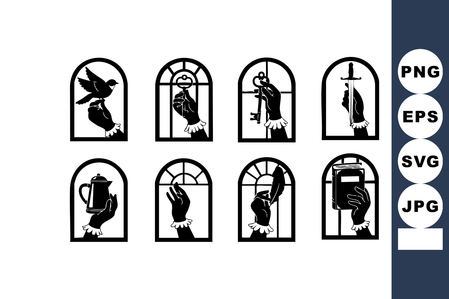 This vector features vintage hands holding different objects framed in arched windows, rendered in classic black silhouette style, conveying an old-fashioned and elegant mood.