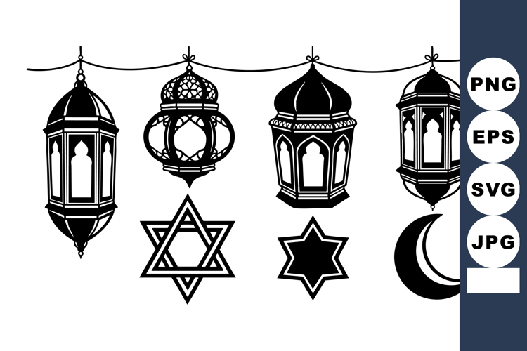 This vector features black and white Hanukkah lanterns alongside Jewish religious symbols like the Star of David and crescent moon, presented in a clean silhouette style. Spiritual and cultural.
