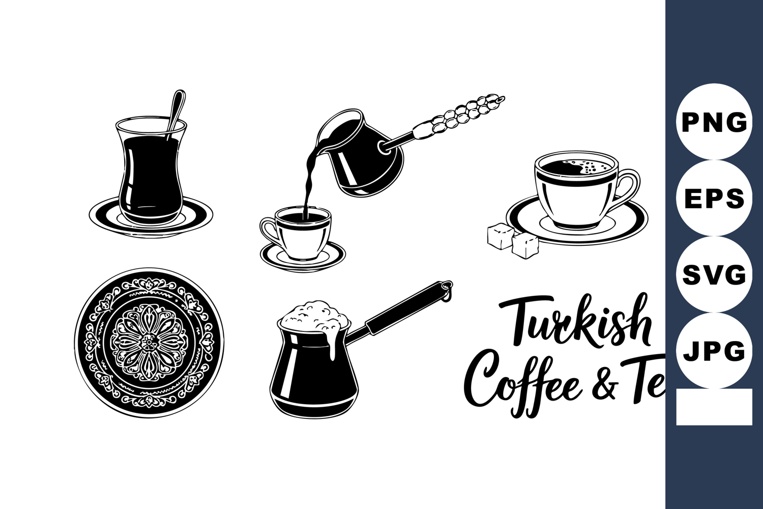This vector shows a traditional Turkish coffee and tea with cezve, glass cups, saucers, sugar cubes, and ornamental plate in black and white style. Classic and elegant.