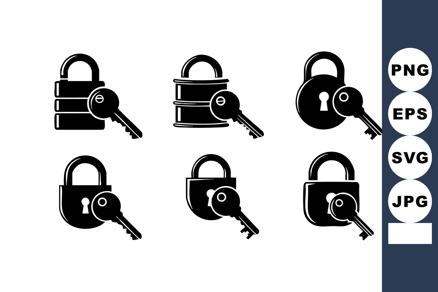 Six black padlock and key vector icons represent security and access control in a minimalist style, conveying protection and privacy themes with clarity and simplicity. Calm mood.