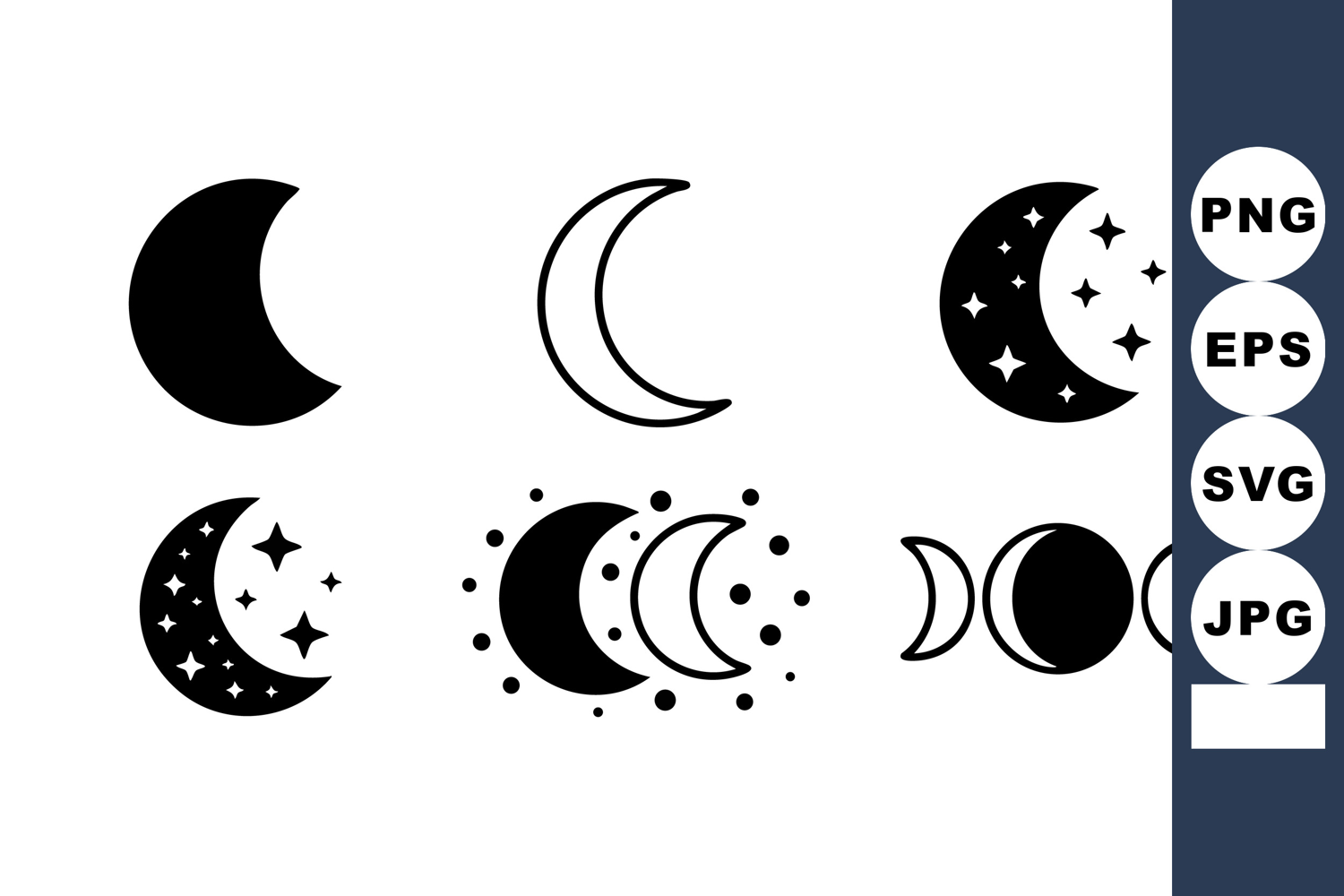 This vector shows various moon phases including crescent, full, new, and waxing in black and white style. Perfect for astronomy or night theme projects. Calm and simple.