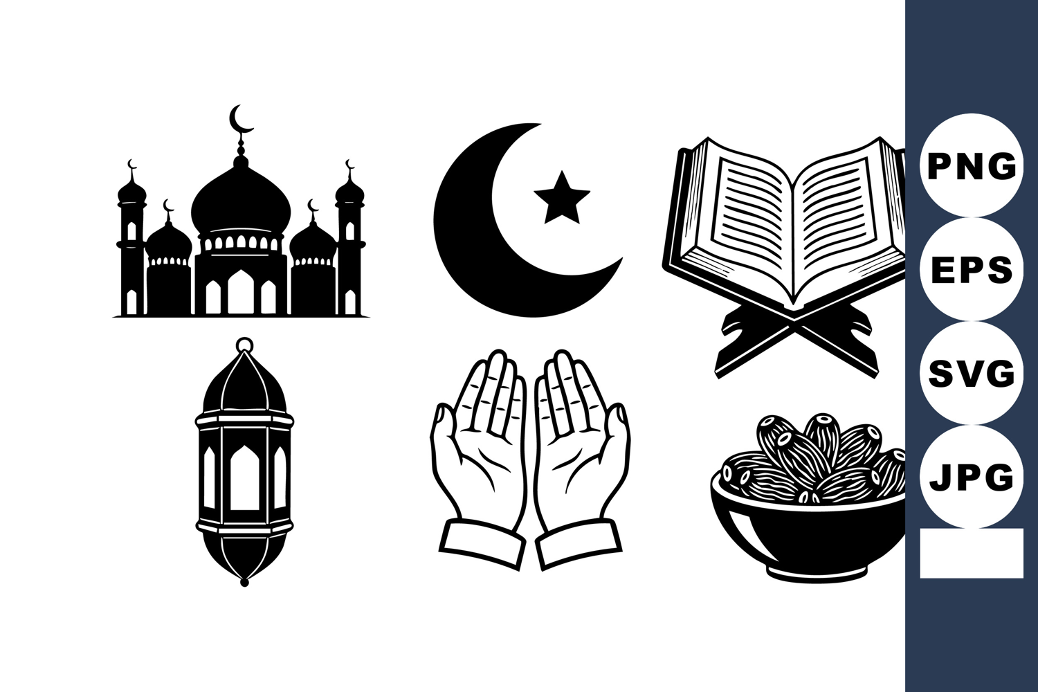 Vector illustration showing Islamic symbols including mosque, crescent star, Quran, praying hands, lantern, and dates bowl in black silhouette style. Spiritual and cultural mood.