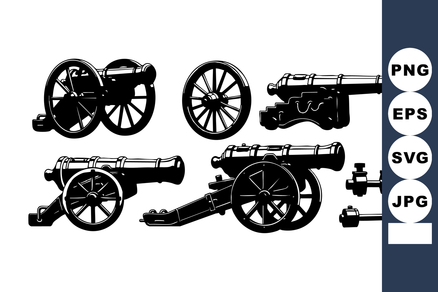 This vector features detailed black silhouettes of vintage cannons and wheels with historical artillery design elements, presented in a clean style. Classic and bold mood.