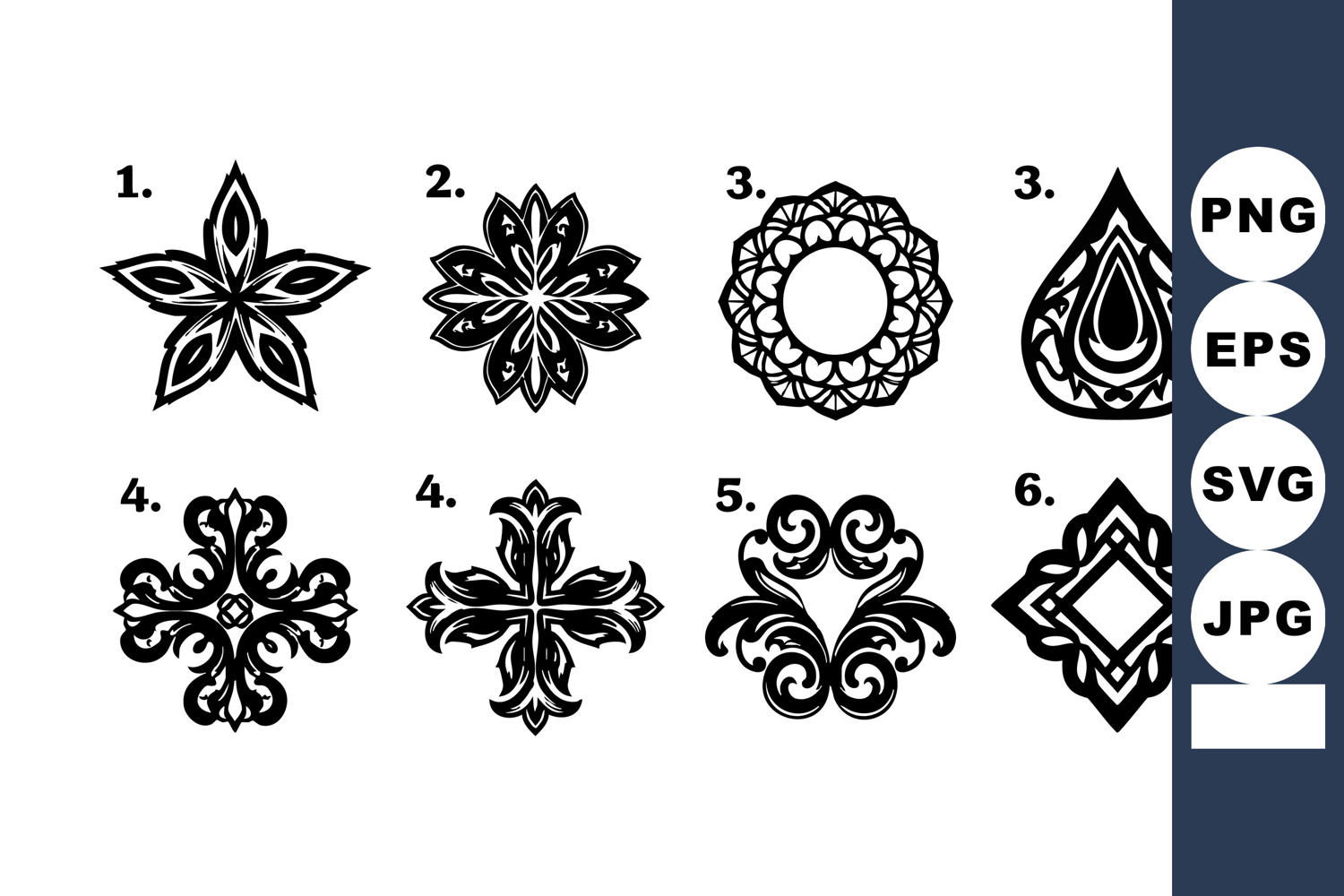 of eight black ornamental vector designs featuring floral and geometric shapes, suitable for decoration and creative pattern making, presented in a clean, bold style. Elegant.