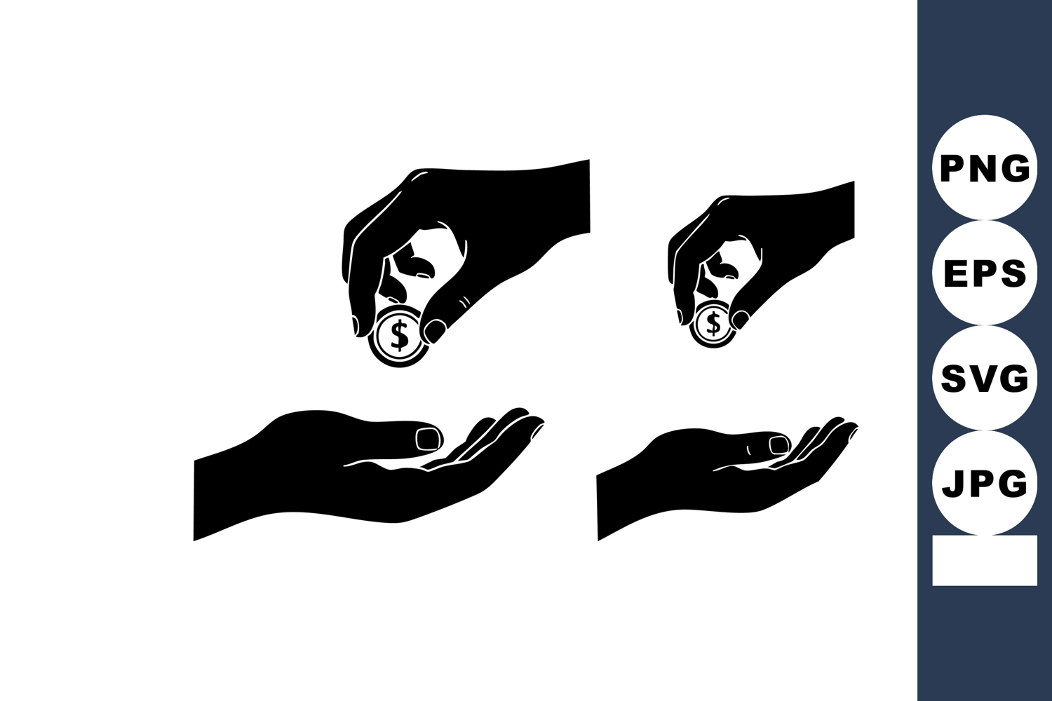 Illustration shows two hands exchanging coins representing charity and donation in simple black silhouette style with clear symbolic meaning, conveying generosity and support mood.