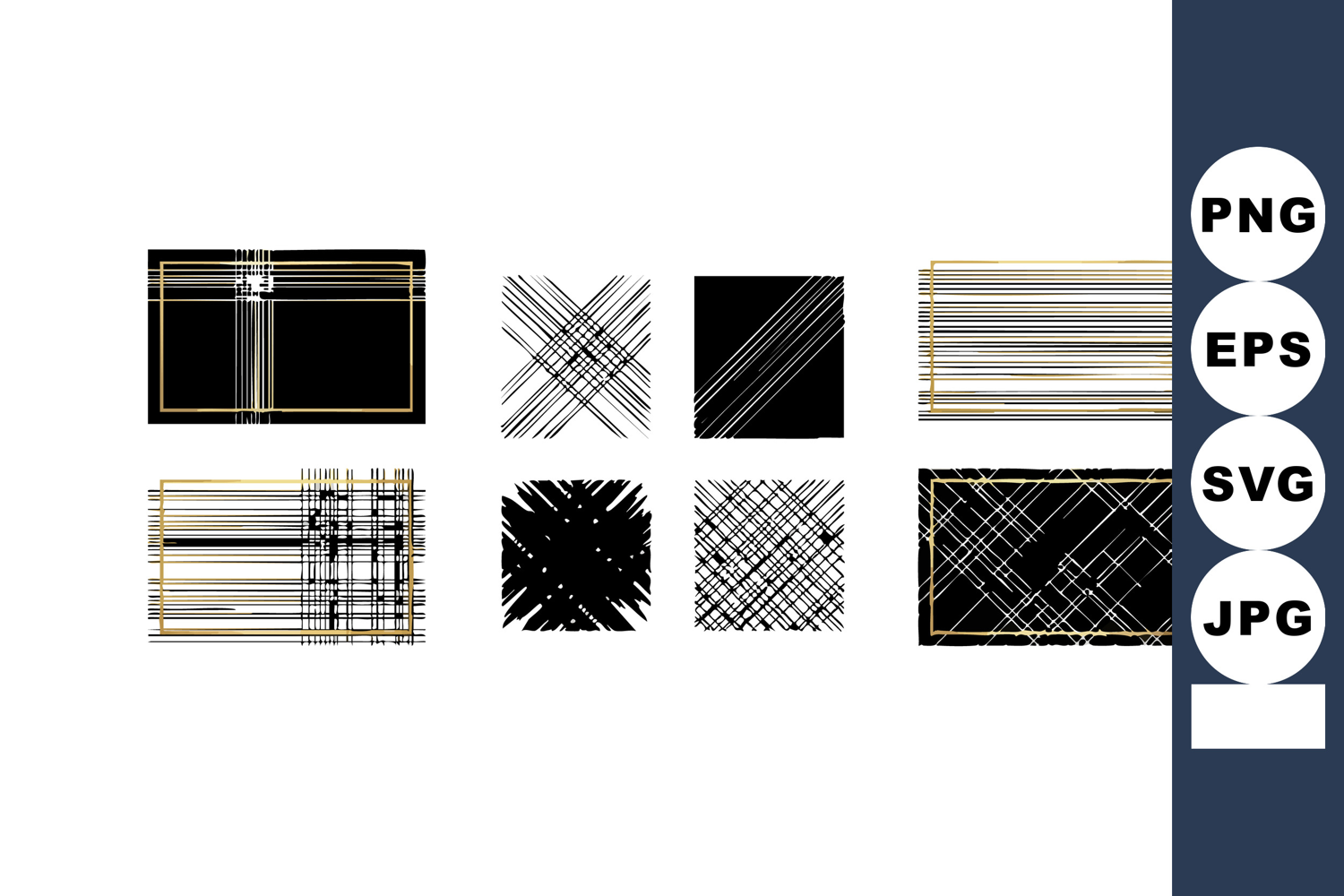 This vector features abstract geometric patterns with black and gold lines arranged in various grid and cross shapes, creating a stylish and elegant modern look. Contemporary mood.
