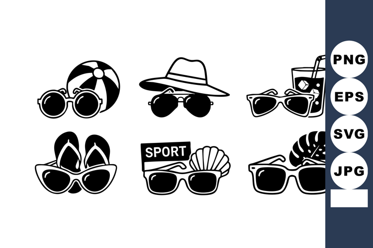This vector set features summer sunglasses paired with hats, flip flops, drinks, and a beach ball, evoking a sunny vacation mood with a playful and relaxed vibe.