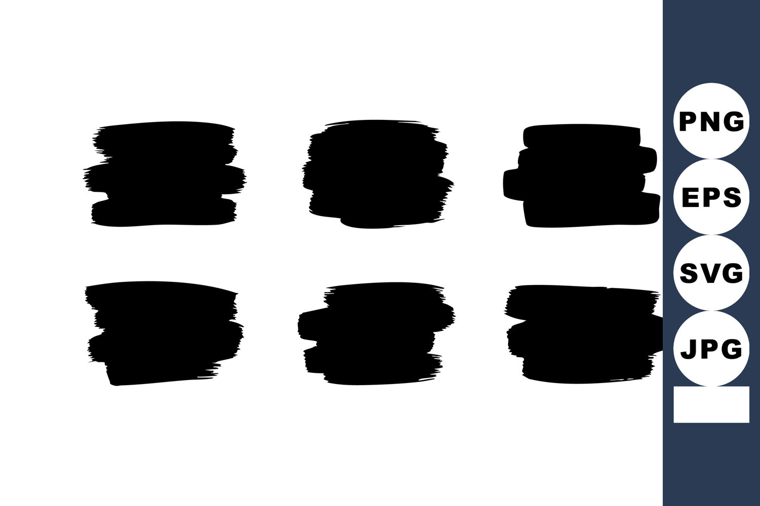 Vector file shows six black brush strokes with rough textures and irregular shapes on a white background, ideal for artistic and graphic design uses. Creative and bold.