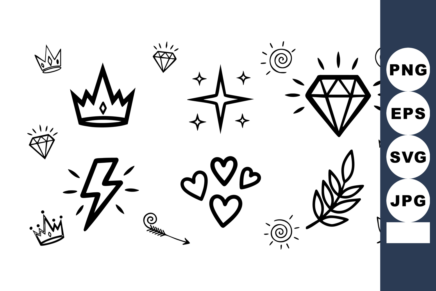 This vector file presents hand drawn simple black line doodles including crowns, diamonds, hearts, lightning bolts, stars, and leaves in a playful style. Charming and whimsical.