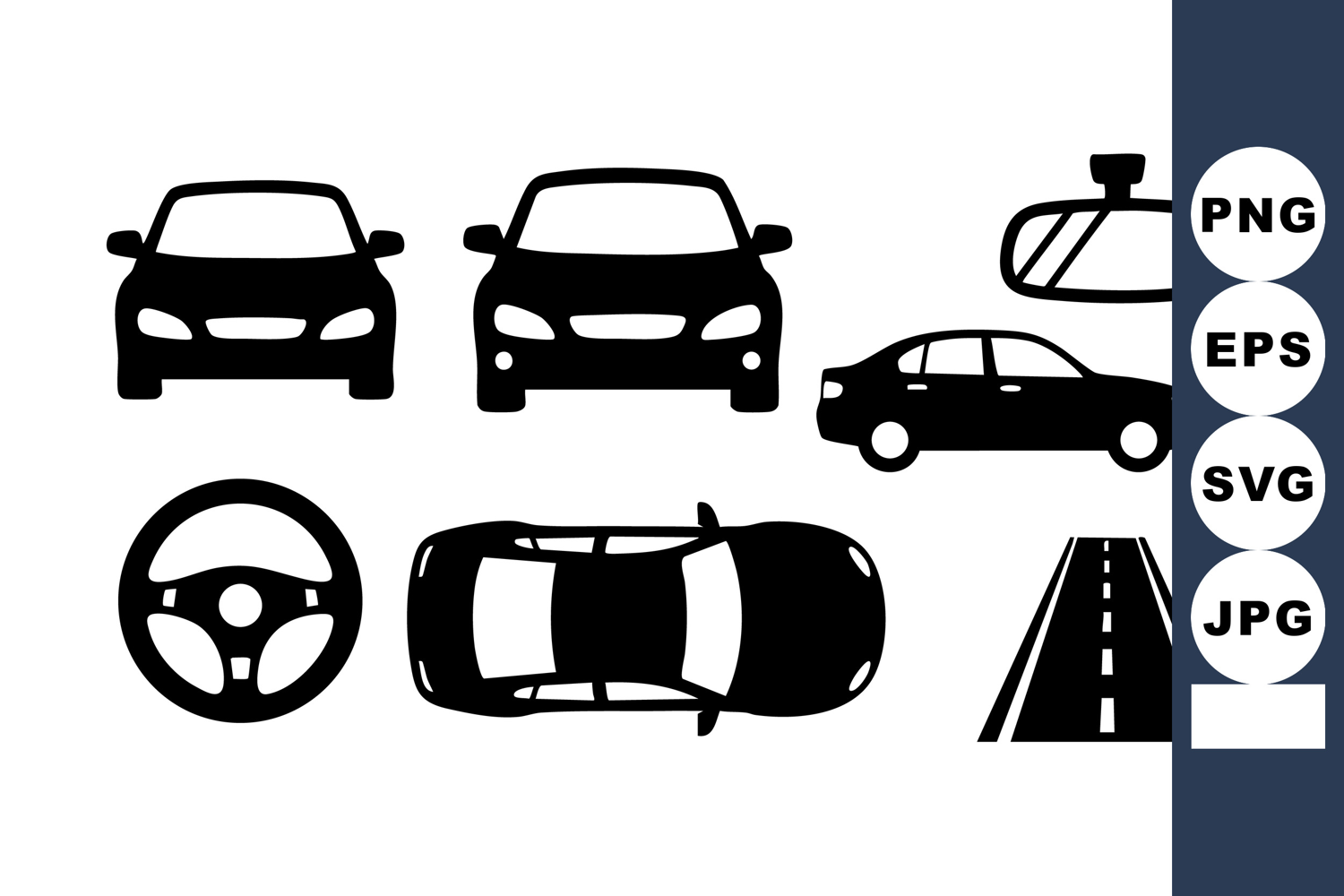 This vector set features black car silhouettes, a steering wheel, a rearview mirror, and a road icon in a simple, flat style. It conveys automotive themes with clarity and minimalism. Clean and modern mood.