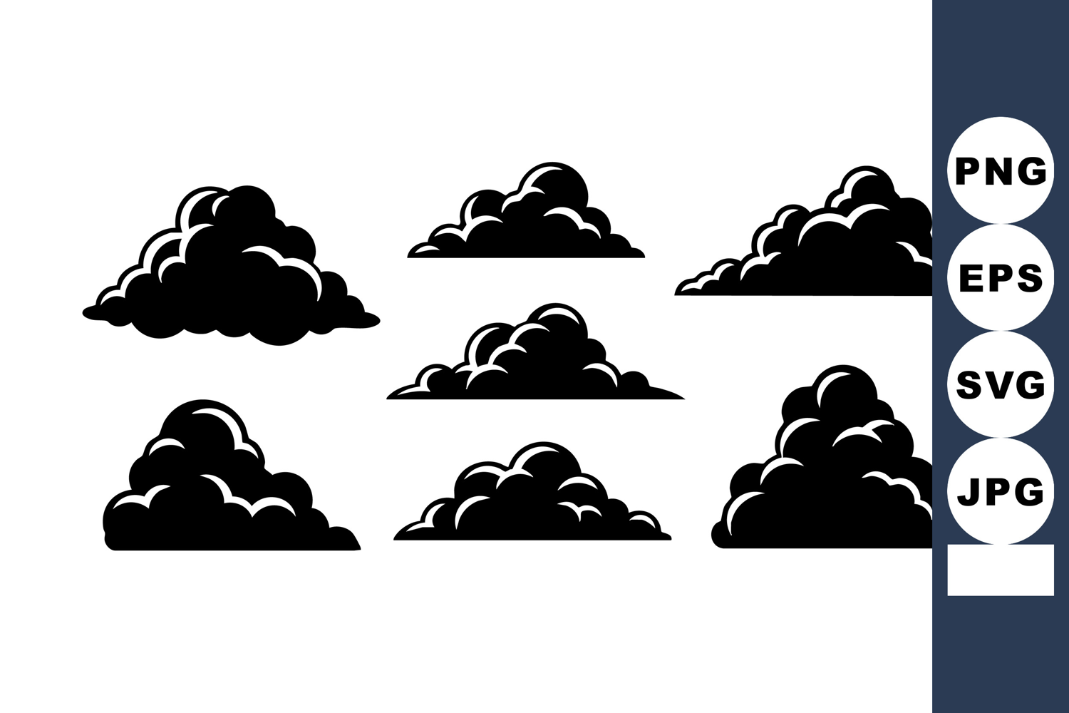This vector set presents seven black silhouette cloud shapes featuring fluffy, soft contours ideal for creative design projects and decorative purposes. Clean and simple style. Calm.