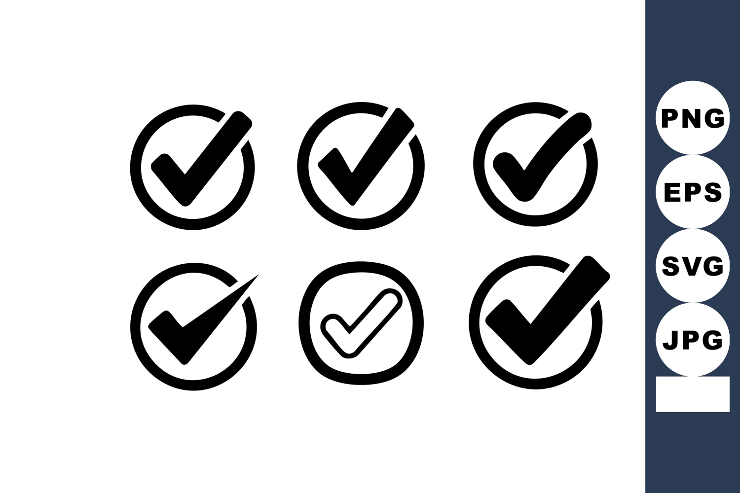 This vector image presents six black and white checkmark icons enclosed in circular borders symbolizing approval, confirmation, and verification in a clean, minimal style. Professional and clear.