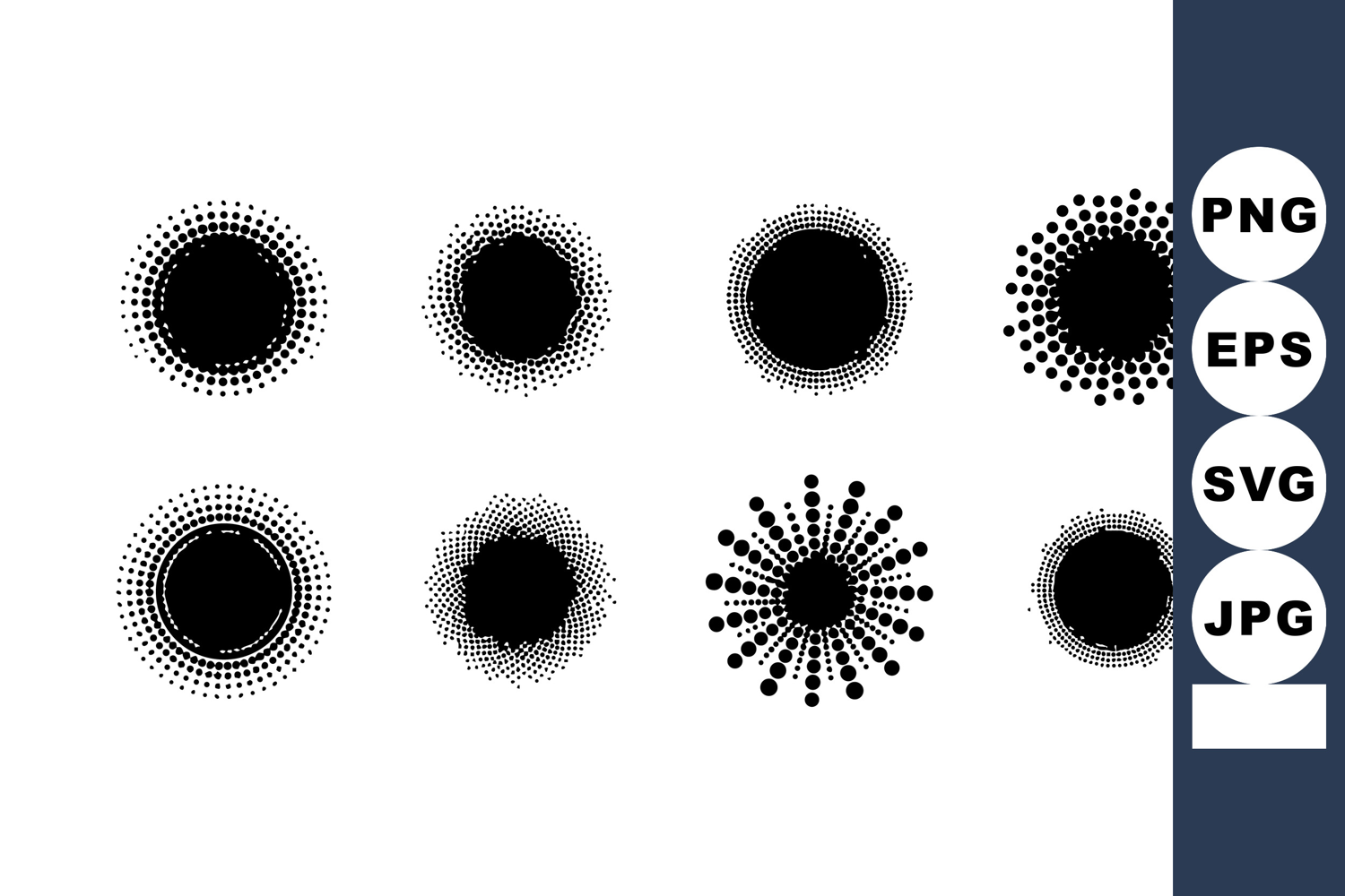 This vector shows eight black halftone circular and dotted patterns in various styles and densities, ideal for graphic design, decoration, and artistic projects. Modern and versatile.