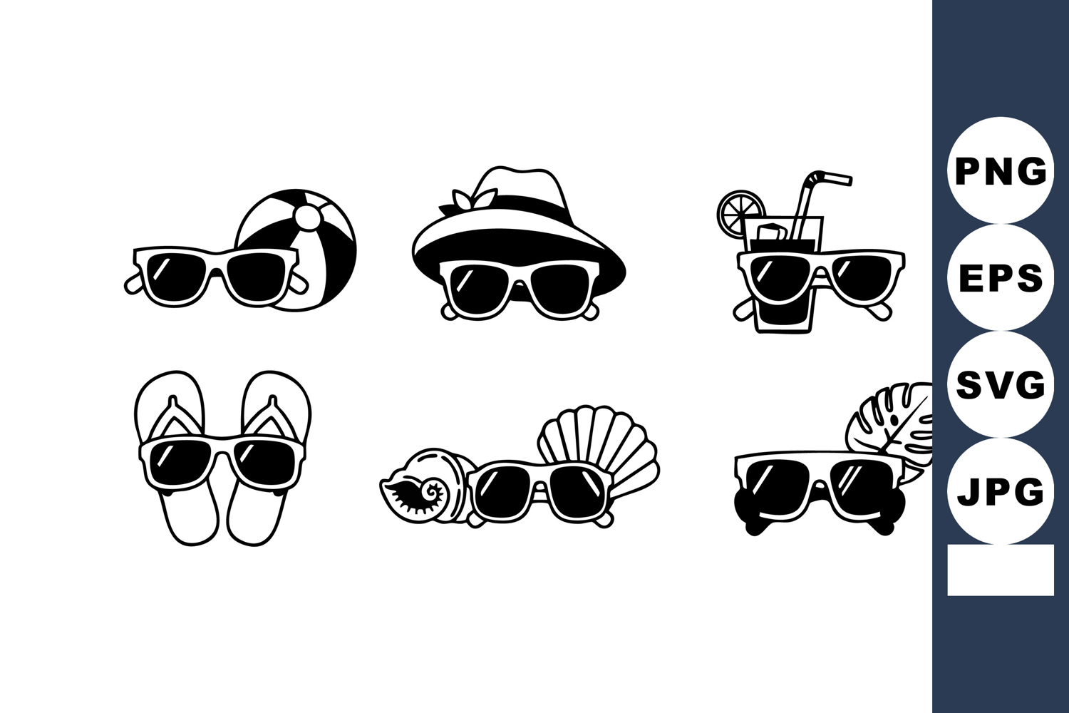 Vector set features summer vacation icons including sunglasses on a beach ball, hat, drink, flip flops, seashell, and tropical leaf, evoking relaxation and fun mood.