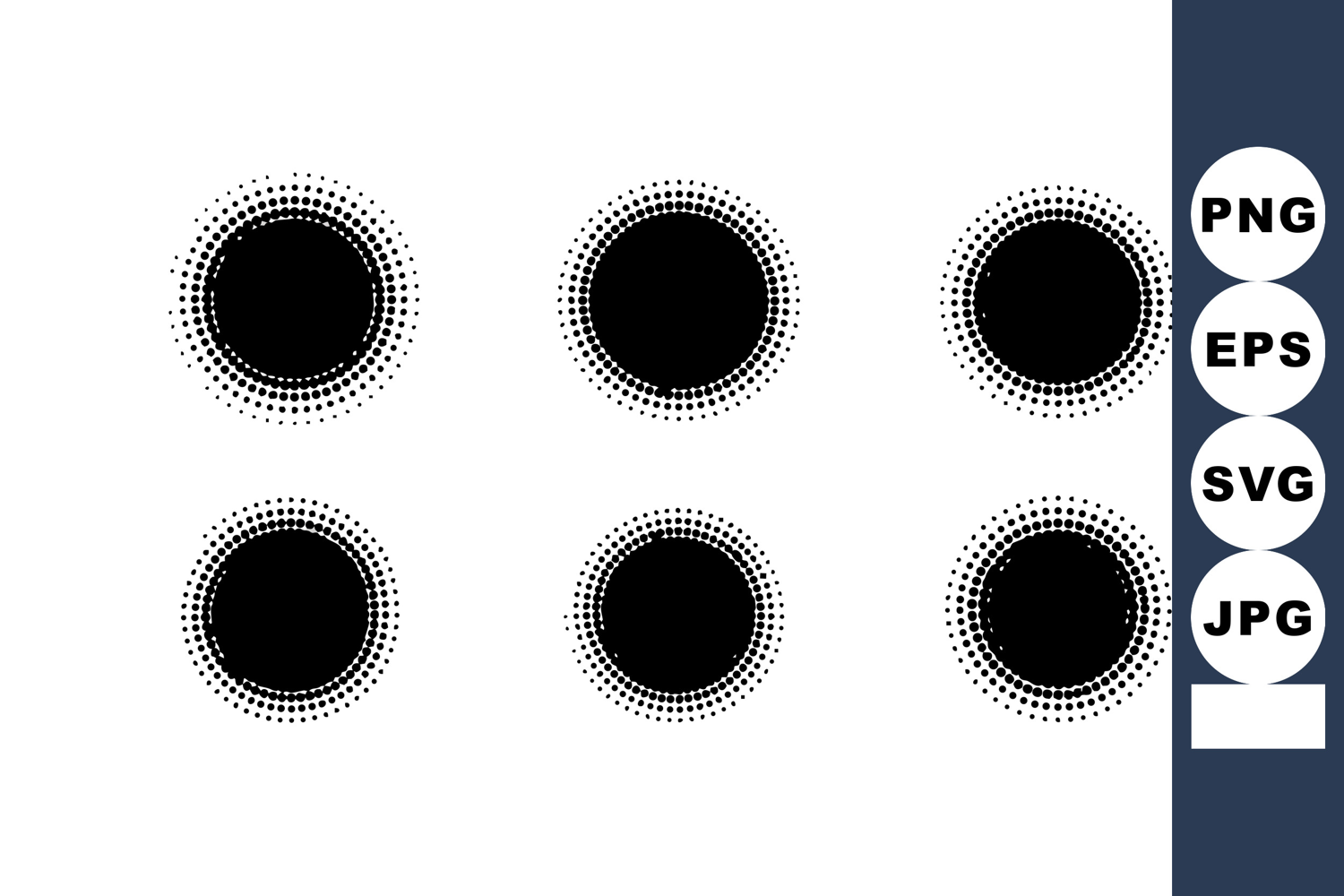 Vector file showing six black halftone circles arranged in two rows with dotted edges. Suitable for digital backgrounds, print design, and creative compositions. Modern and clean style.