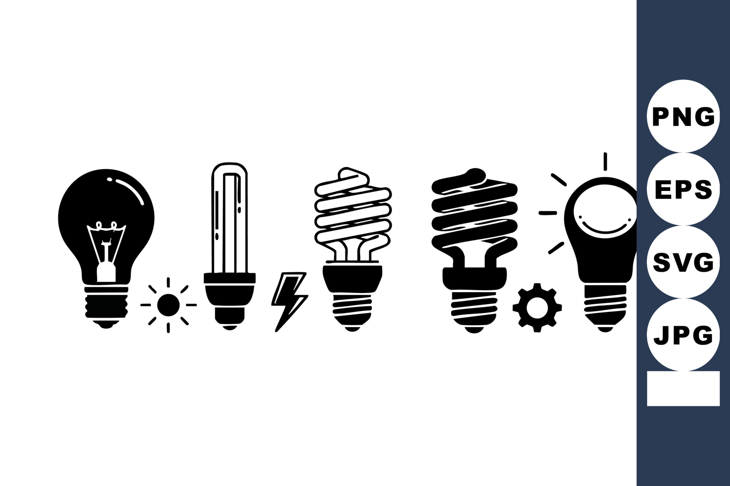 This vector illustration shows different styles of light bulbs and energy symbols in black and white, representing innovation and electricity with a clean, modern look. Bright and simple mood.