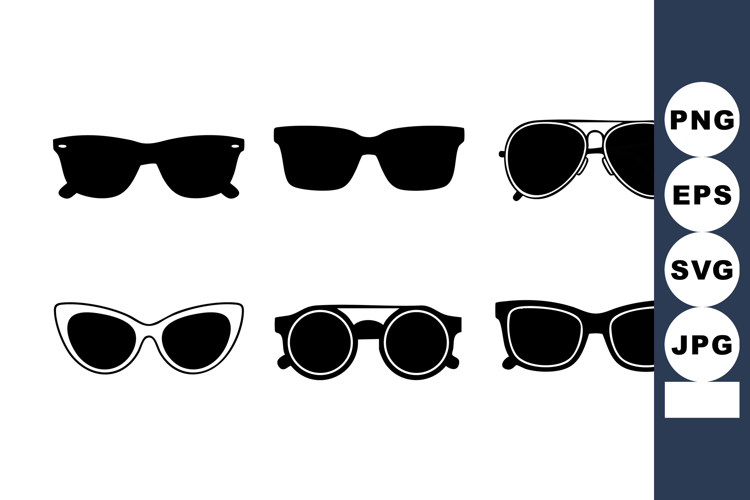 Vector illustration of diverse sunglasses styles featuring black frames and lenses, including aviator, cat eye, and wayfarer designs, presented in a clean flat style. Stylish and modern.