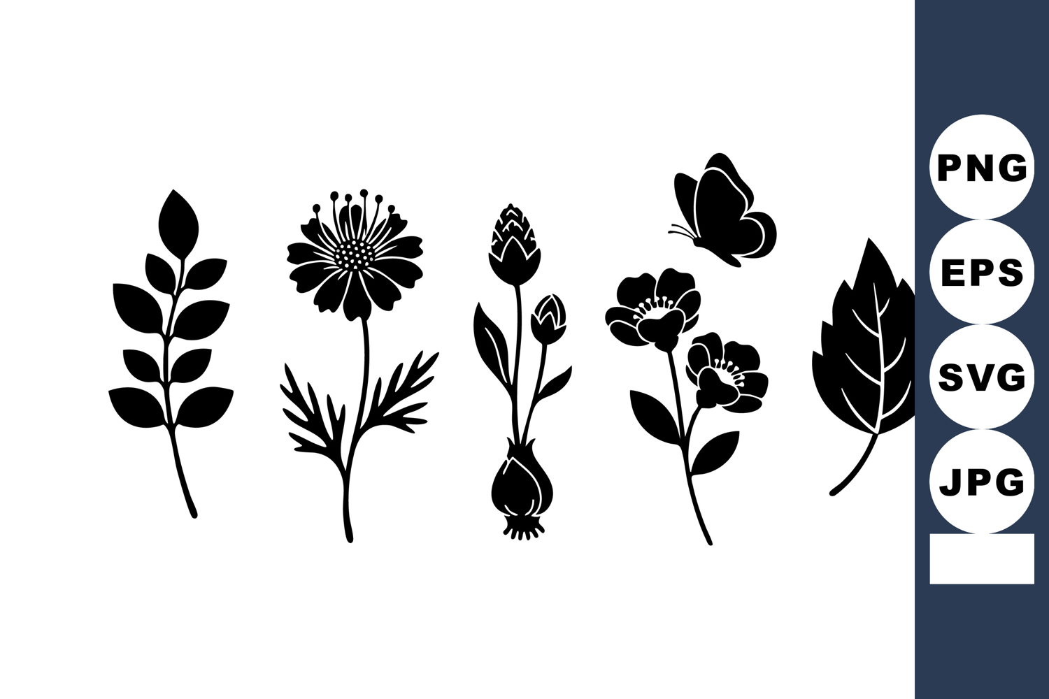 This vector features black silhouettes of various leaves and flowers, showcasing botanical diversity in a clean, minimalist style. Ideal for nature-themed design projects. Calm and elegant.