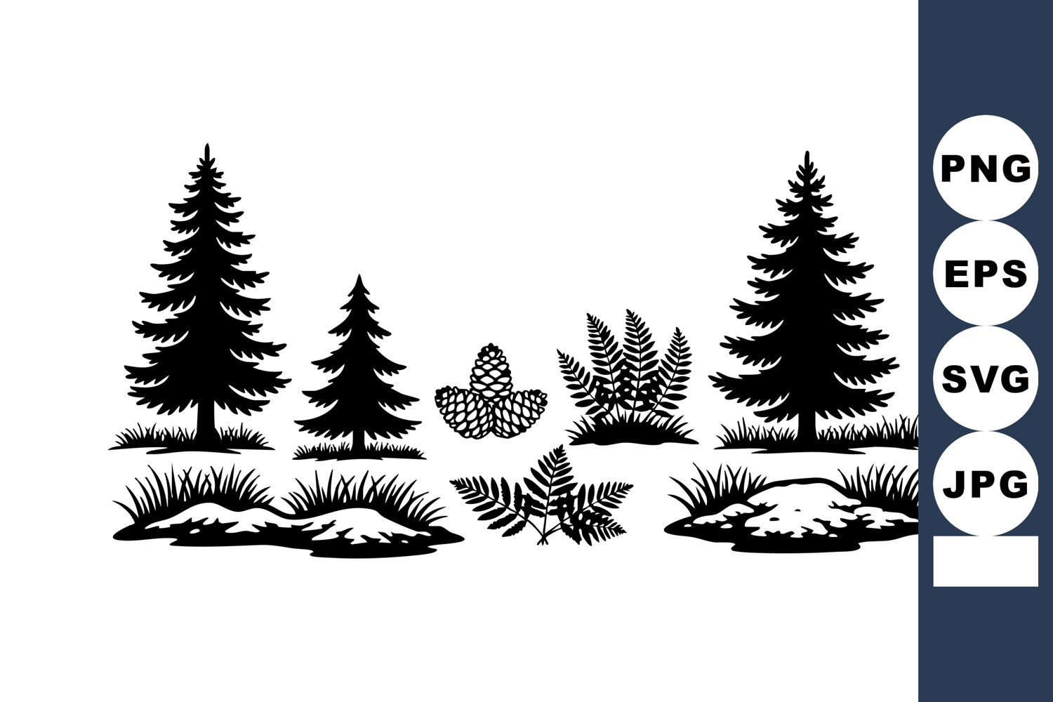 Vector image shows black silhouettes of pine trees, ferns, pine cones, grass patches, and mossy ground, ideal for natural and botanical themed projects, calm and organic mood.
